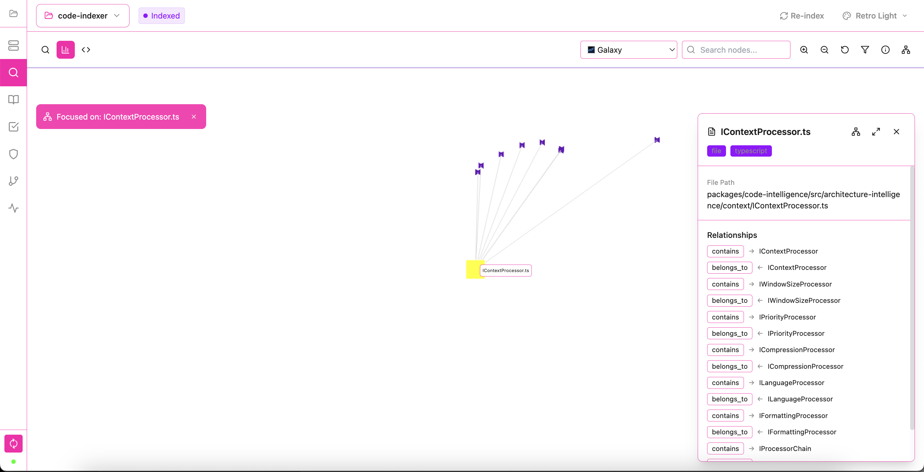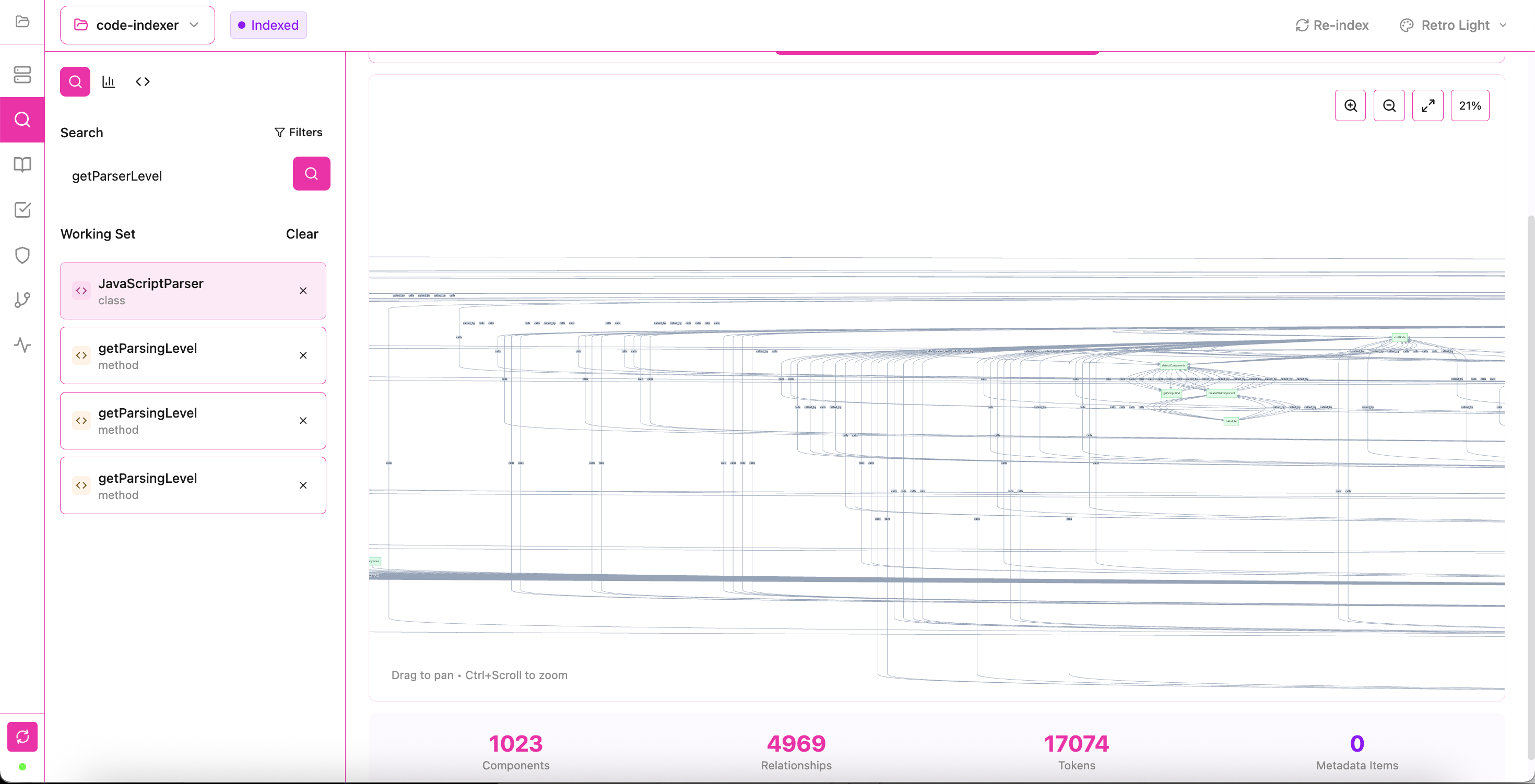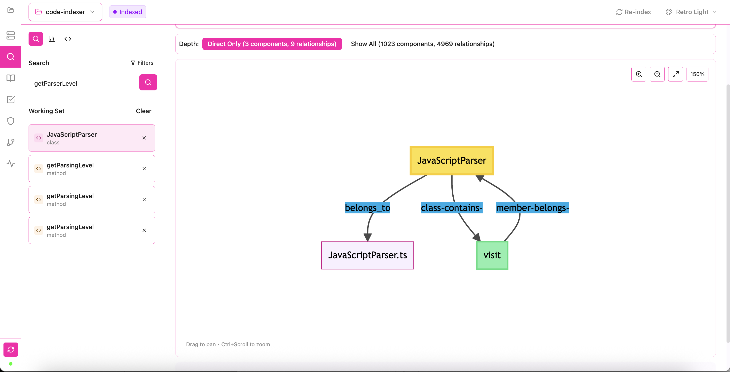 Toggle relationship types on/off. Show only imports, only calls, only inheritance. Simplify complex graphs instantly.