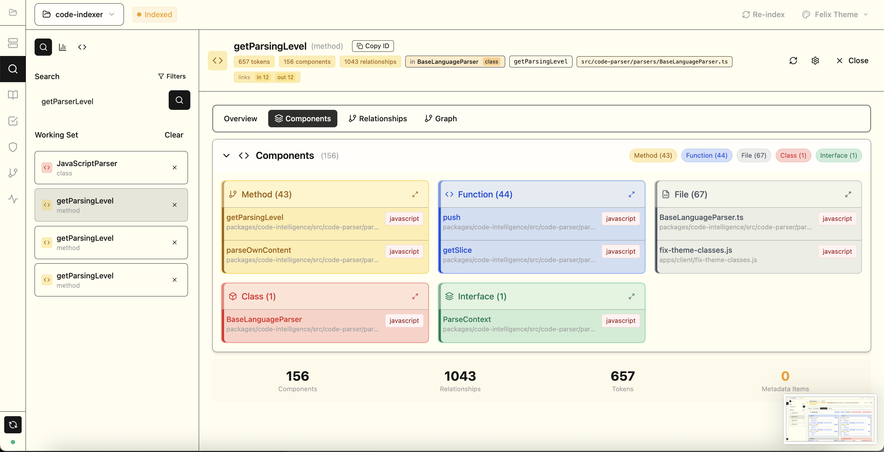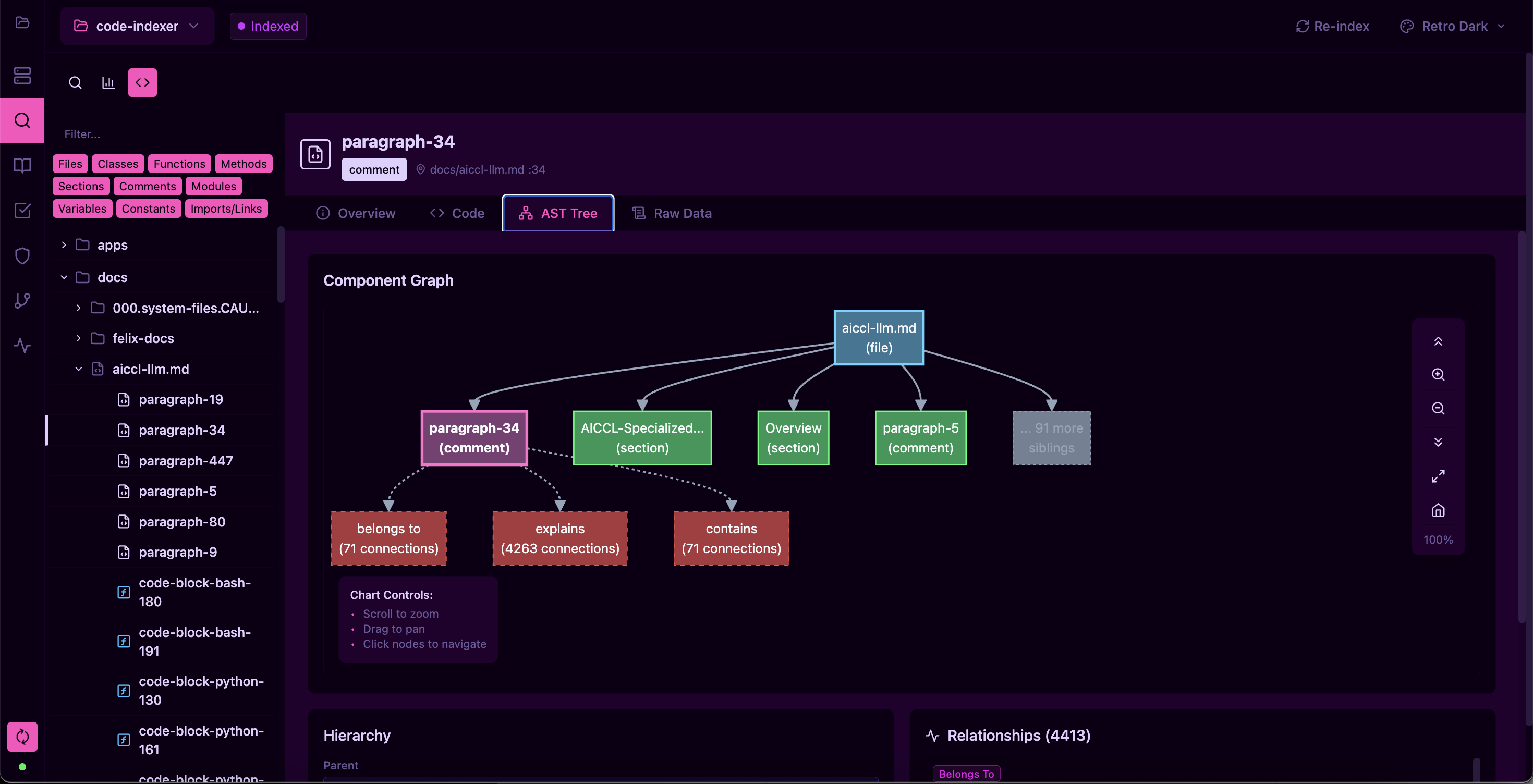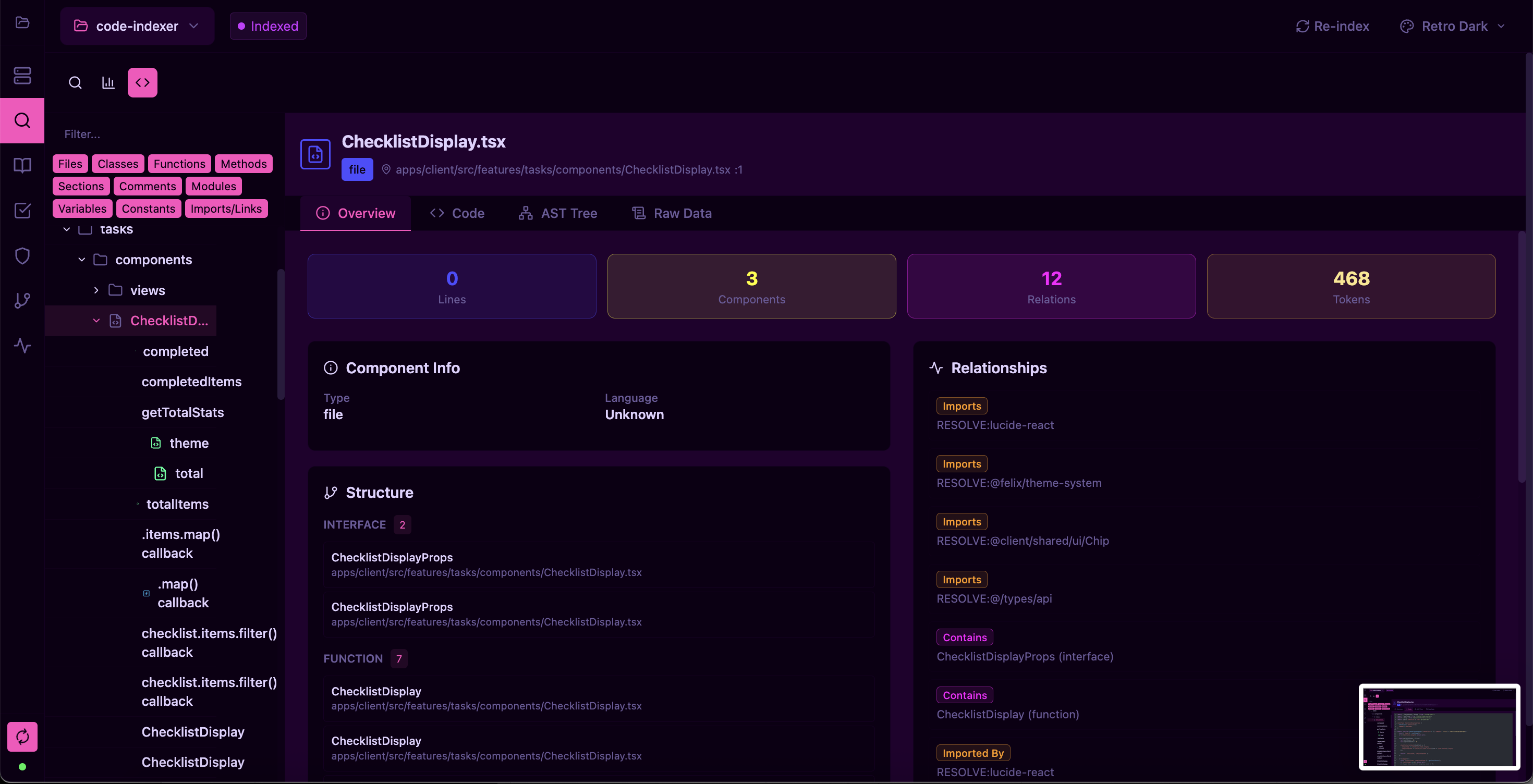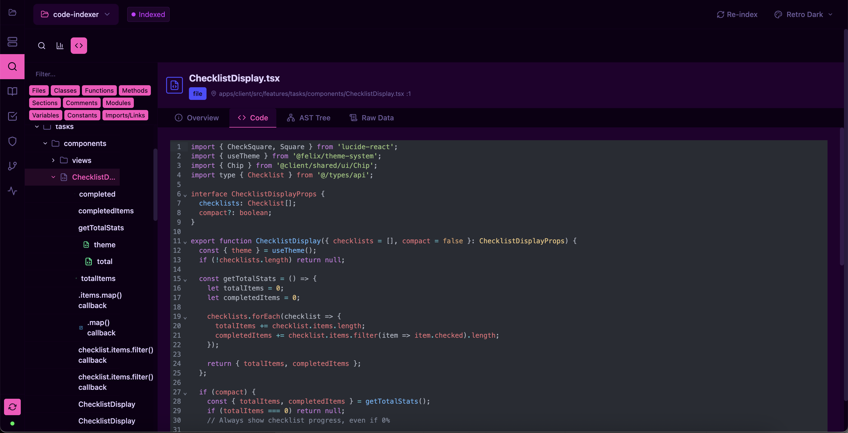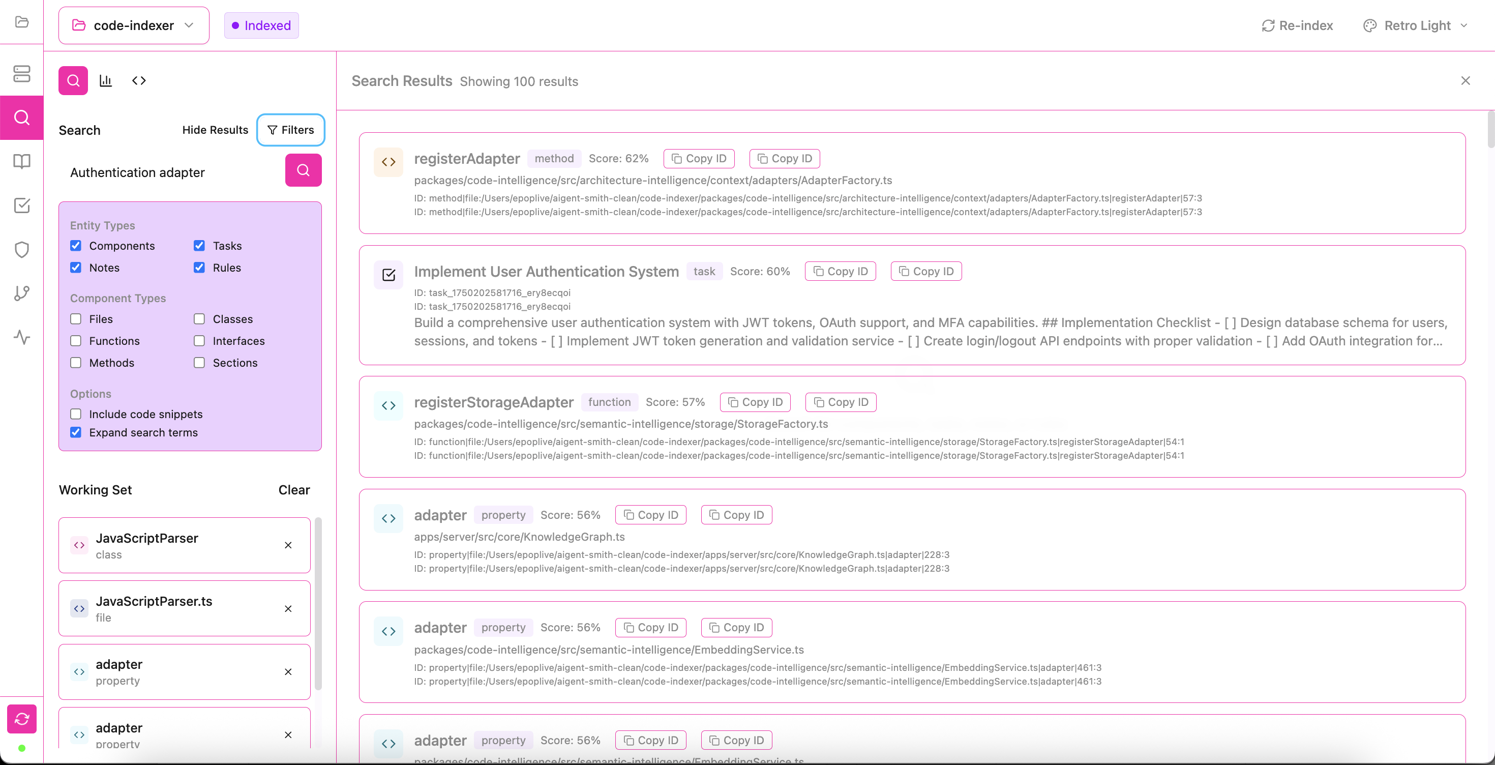 Semantic search via embeddings + structural search via AST. Filter by language, component type, file path.