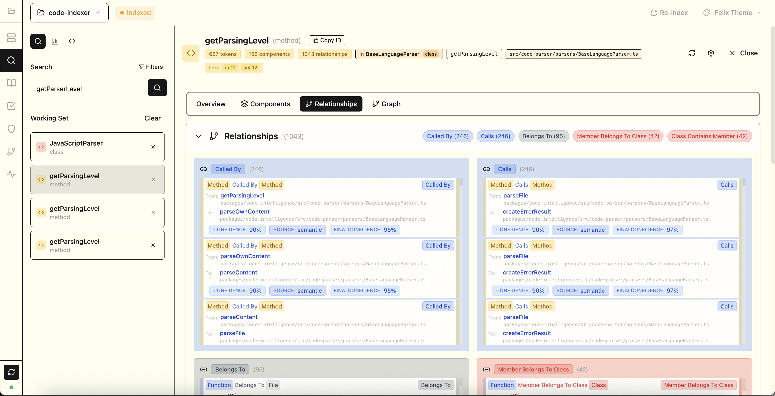 Dockable panel showing source code, relationships, metadata. Navigate between connected components.